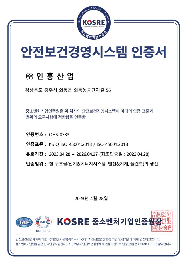 안전보건경영시스템 인증서 (국문) 페이지 정보 작성자 인흥산업 댓글 댓글 0건 조회Hit 45회 작성일Date 25-05-28 08:39 본문 안전보건경영시스템 인증서 목록 이전글안전보건경영시스템 인증서(영문) 25.05.28 다음글형강의 홀 가공장치 특허증 25.05.28 댓글 0 댓글목록 등록된 댓글이 없습니다.