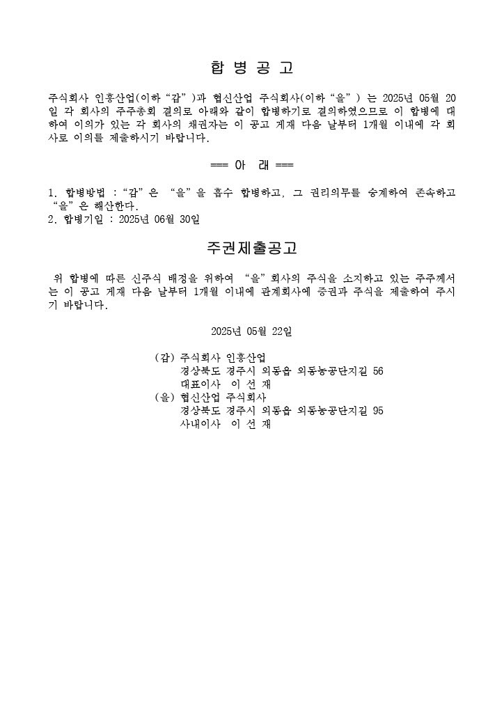 합병에 따른 채권자 이의제출 공고 페이지 정보 작성자 인흥산업 댓글 댓글 0건 조회Hit 332회 작성일Date 25-05-22 11:50 본문 합병에 따른 채권자 이의제출 공고 목록 댓글 0 댓글목록 등록된 댓글이 없습니다.